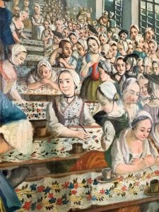 Image of dozens of young girls painting flowers on the cotton cloth/fabrics with a brush. (pinceau) The original title of the performance in French is “Les pinceauteuses”. The workshop is from Manufacture Johann Rudolf Wetter in Saint Marcel (Orange), dated 1785. The painting is part of the collection of Musée d’ Orange -Provence. France