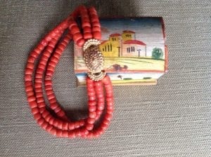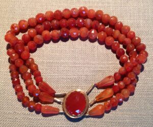 5 slag bloedkoralen collier met gouden haakslot bezet met bloedkoraal. Walcheren-Zeeland. 19e eeuw.