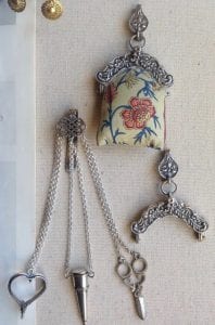 Zilveren poppen châtelaine bestaande uit gordelhaakje met drie kettingen waaraan een speldenkussentje, naaldenkokertje en schaartje. Afmeting haakje tot onderkant schaartje etc. ca.12 cm.