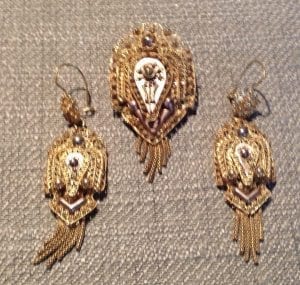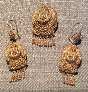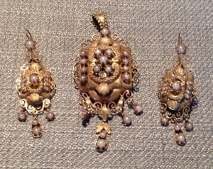 Gouden parure. Sluitbroche met stel oorhangers. Noord-Brabant-Limburg. 2e helft 19e eeuw.