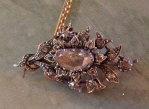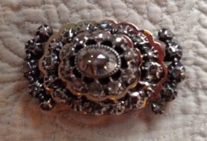 Zilveren tak broche bezet met roos geslepen diamantjes met in het midden een buitengewoon groot model diamant oud slijpsel, “Bolsjewiek” genaamd. De steen is grof geslepen en op zilverfolie gezet. Het zilver folie heeft in de loop van meer dan 100 jaar aan glans verloren ( vocht) waardoor het effect van de diamant is verminderd. Gedragen met name in Noord Holland ( West Friesland) ook in Friesland. 19e eeuw.