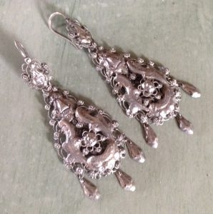Stel zilveren kaphangers gedragen tijdens de rouw. Midden – en zuidelijk Nederland. De scharnierende zwanenhals sluiting is ooit vervangen door een zilveren haak. Lengte 7.5 cm.