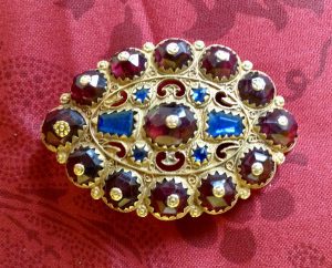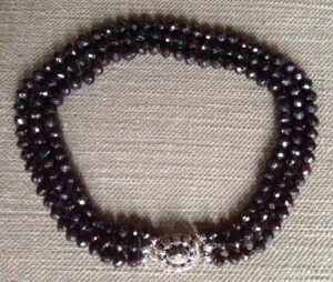 5 slag granaten collier met gouden haakslot bezet met granaten. Gedragen in Walcheren=Zeeland. 19e eeuw.