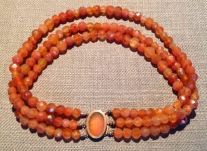 Antiek halscollier bestaande uit 3 slagen facet geslepen kornalijn aan ovaal gouden bakslot. Nederland 1850.