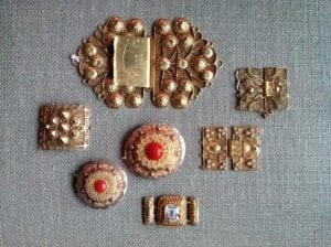 Verschillende gouden haaksloten, baksloten uit Zeeland en de Noord Veluwe. De ronde sloten uit de Noord Veluwe zijn in het midden versierd met bloedkoraal . Rond 1900. Het haakslot midden onder is versierd met haarwerk midden 19e eeuw. Het “pukkelslot” midden linkerzijde is verkocht.