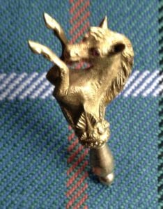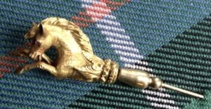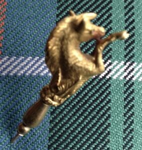 Antiek gouden speld in de vorm van een springend paard. In één oogje is een robijntje gemonteerd. Werd ook wel gedragen als versiering aan een gouden horlogeketting. Rijke boerenstand 2e helft 19e eeuw. Afmeting van begin voeten tot aan de schroef 3 cm.