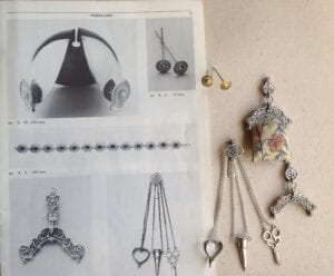 Van alle voorwerpen/sieraden zijn tekening/schetsen gemaakt met o.m. de hoeveelheid zilver die benodigd is voor een sieraad of gebruiksvoorwerp zoals een chatelaine of tasbeugeltje.