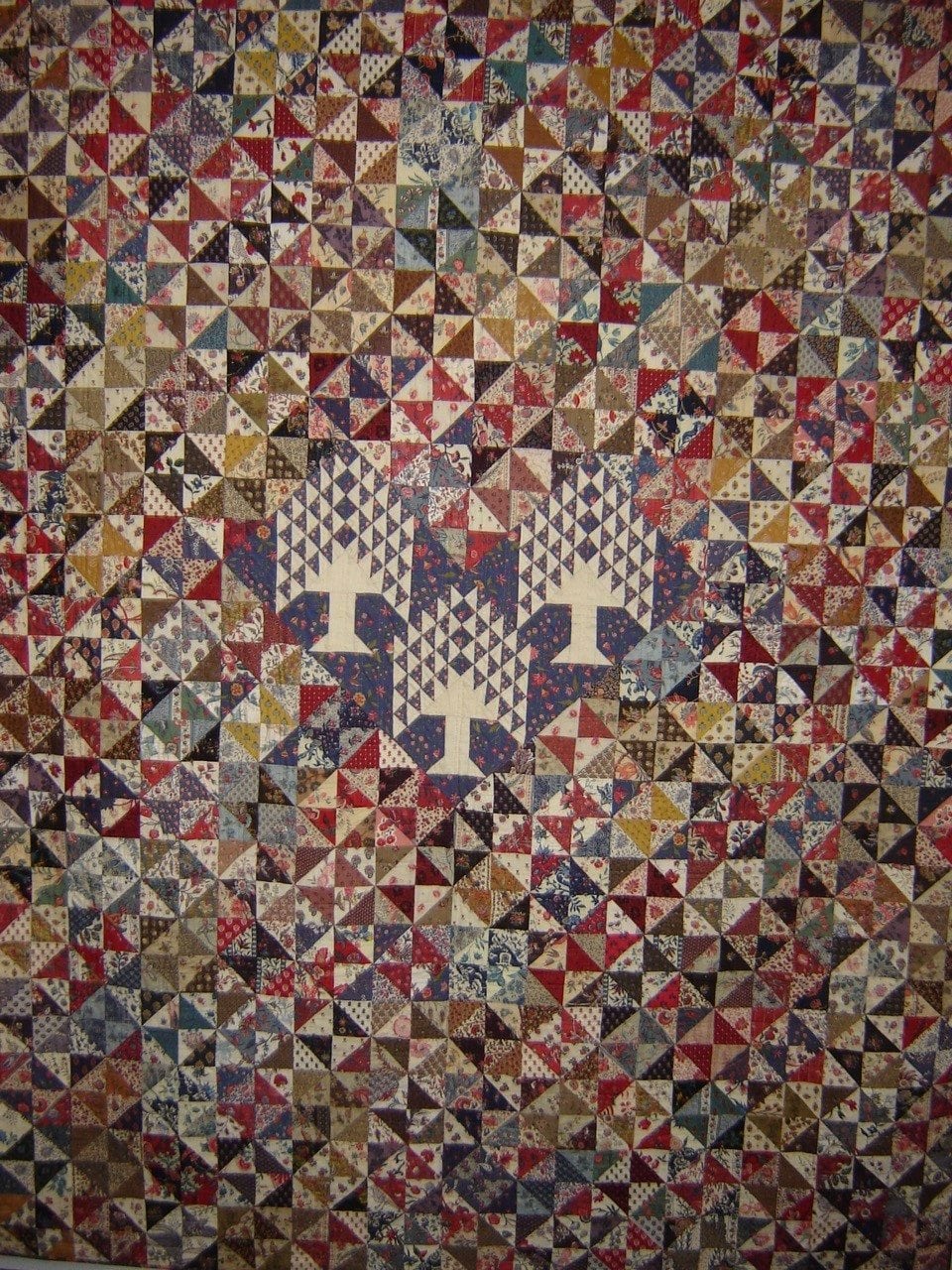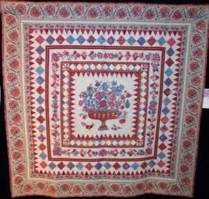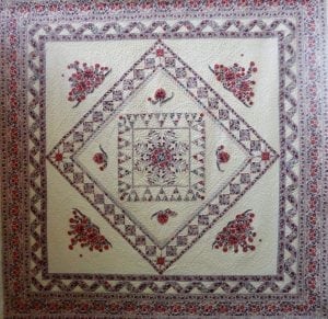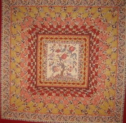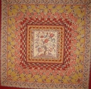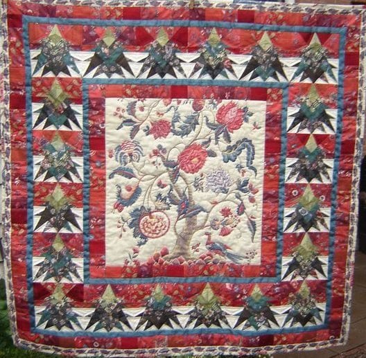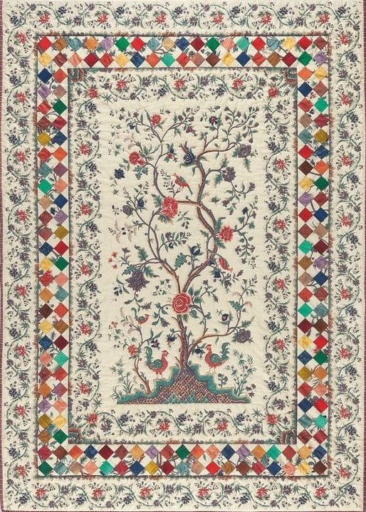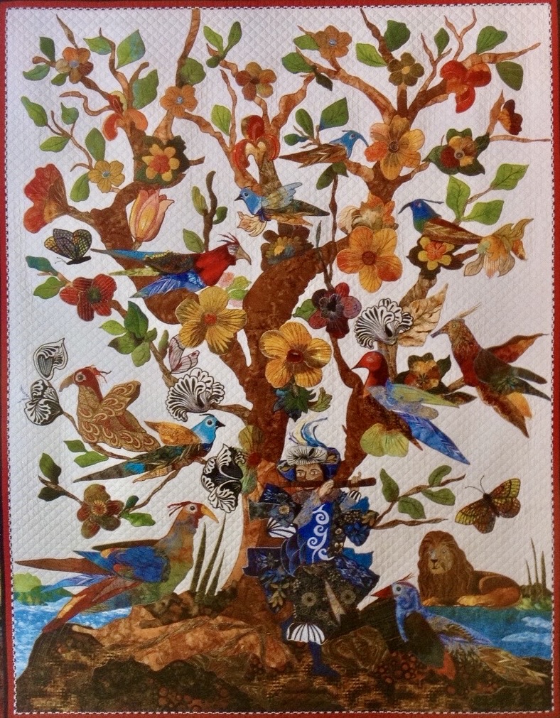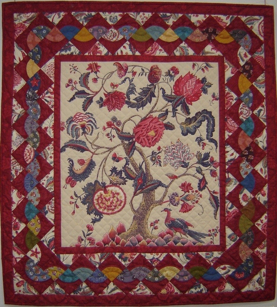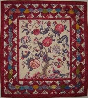 wilden wij van deze ontwerp tekening een vrije vertaling in onze stoffen laten maken in quilt- en applicatietechnieken groot formaat. Onze opdracht leek duidelijk echter het resultaat bleek na voltooing vrijwel zonder gebruik van onze stoffen gerealiseerd te zijn. Ondanks het gemis van de link met onze collectie, stond de levensboom quilt jarenlang symbool voor onze Franse onderneming en hebben veel bezoekers zich kunnen vergapen aan de zeer fraaie compositie en toegepaste techniek van deze levensboom quilt.