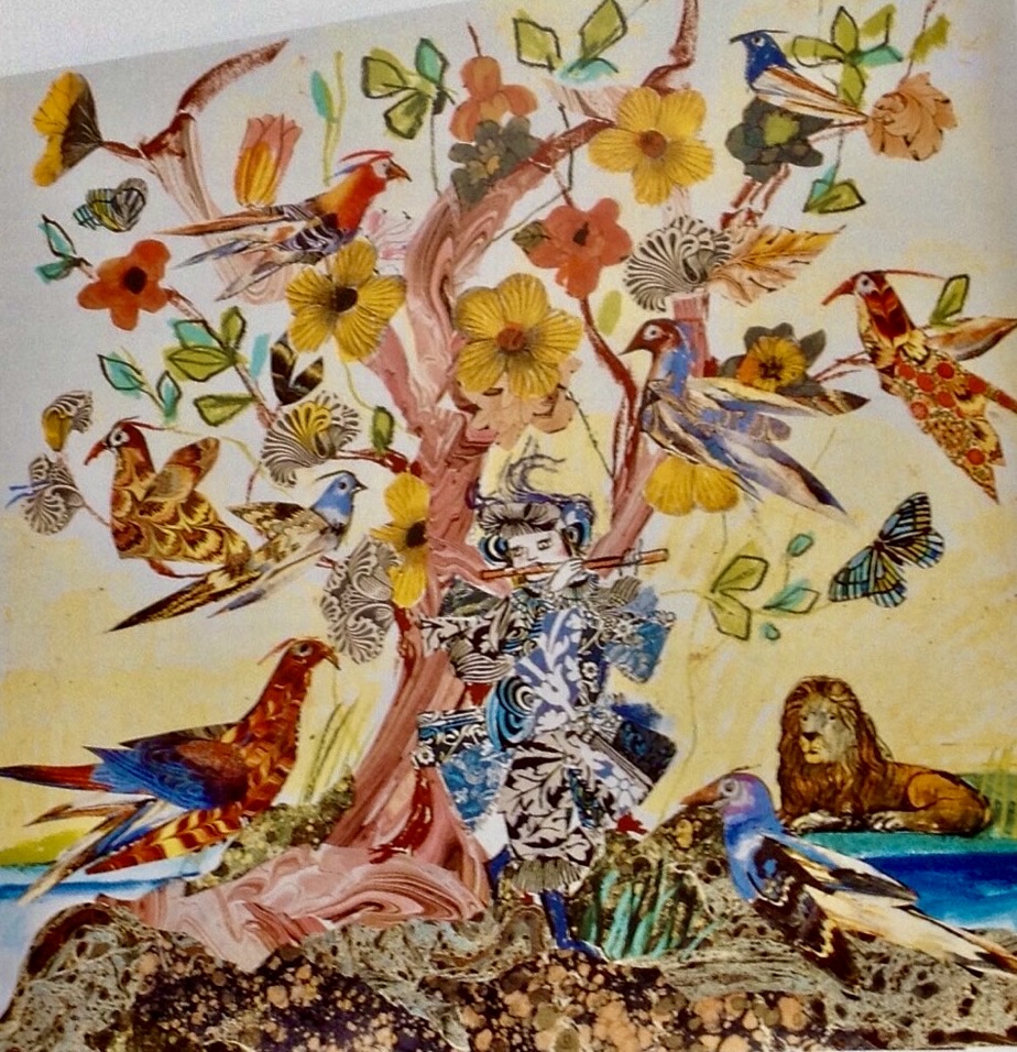 Allereerst tonen wij u uit privé een origineel op papier geschilderde levensboom. De opzet is geschilderd in combinatie met knip- en plakwerk. Centraal staat de boom met fluitspeler, in de boom de fantasiebloemen en vogels met o.m. de leeuw aan het wortelblok ter rechterzijde.