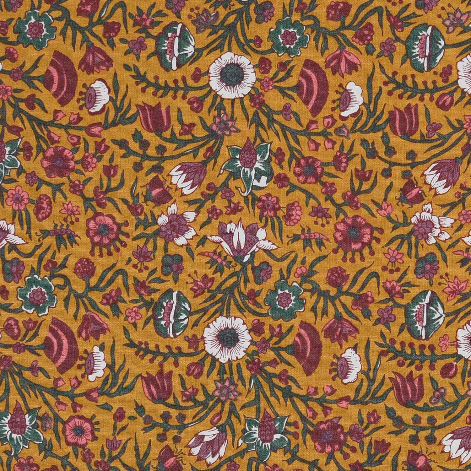 Ochre background with small flowers in red and green.