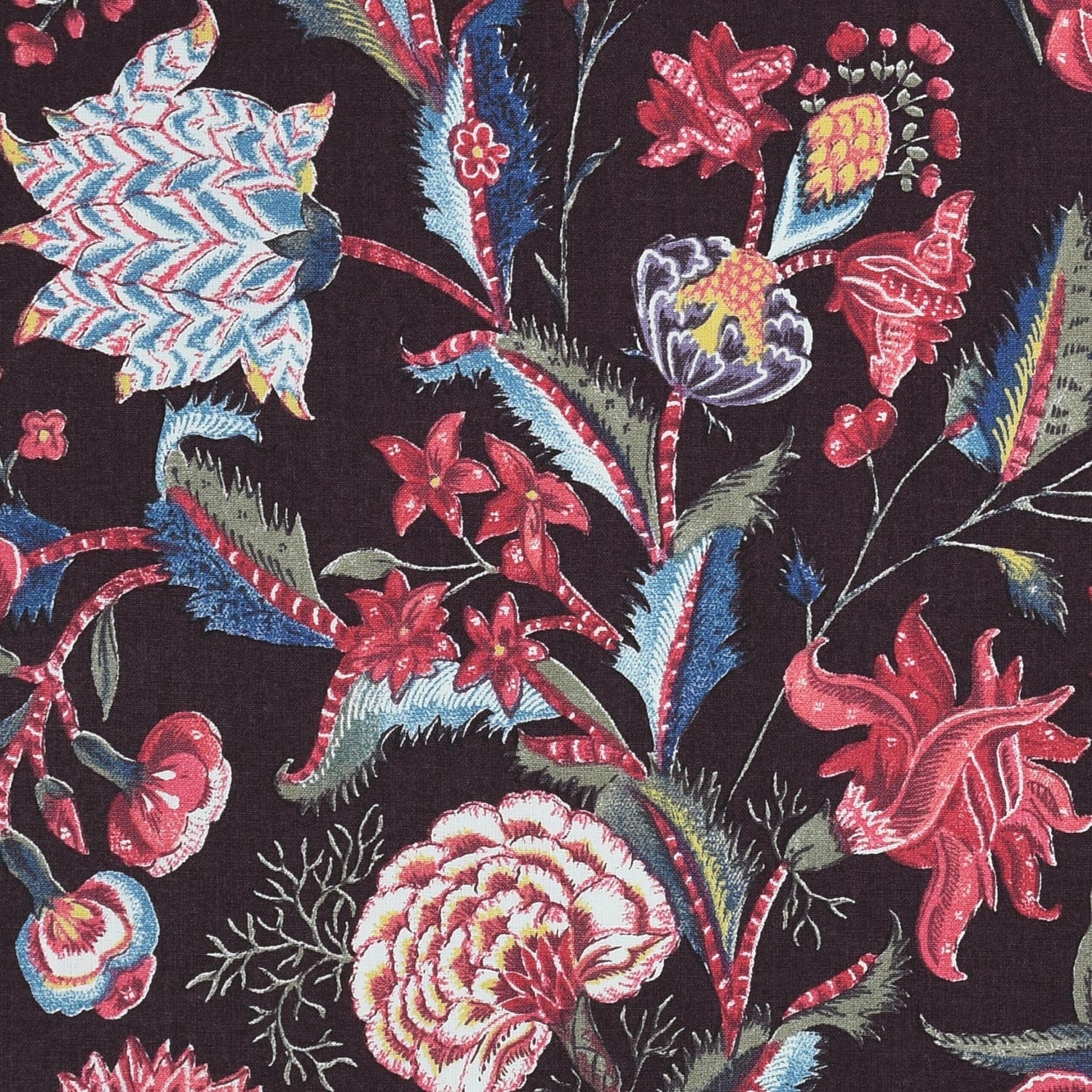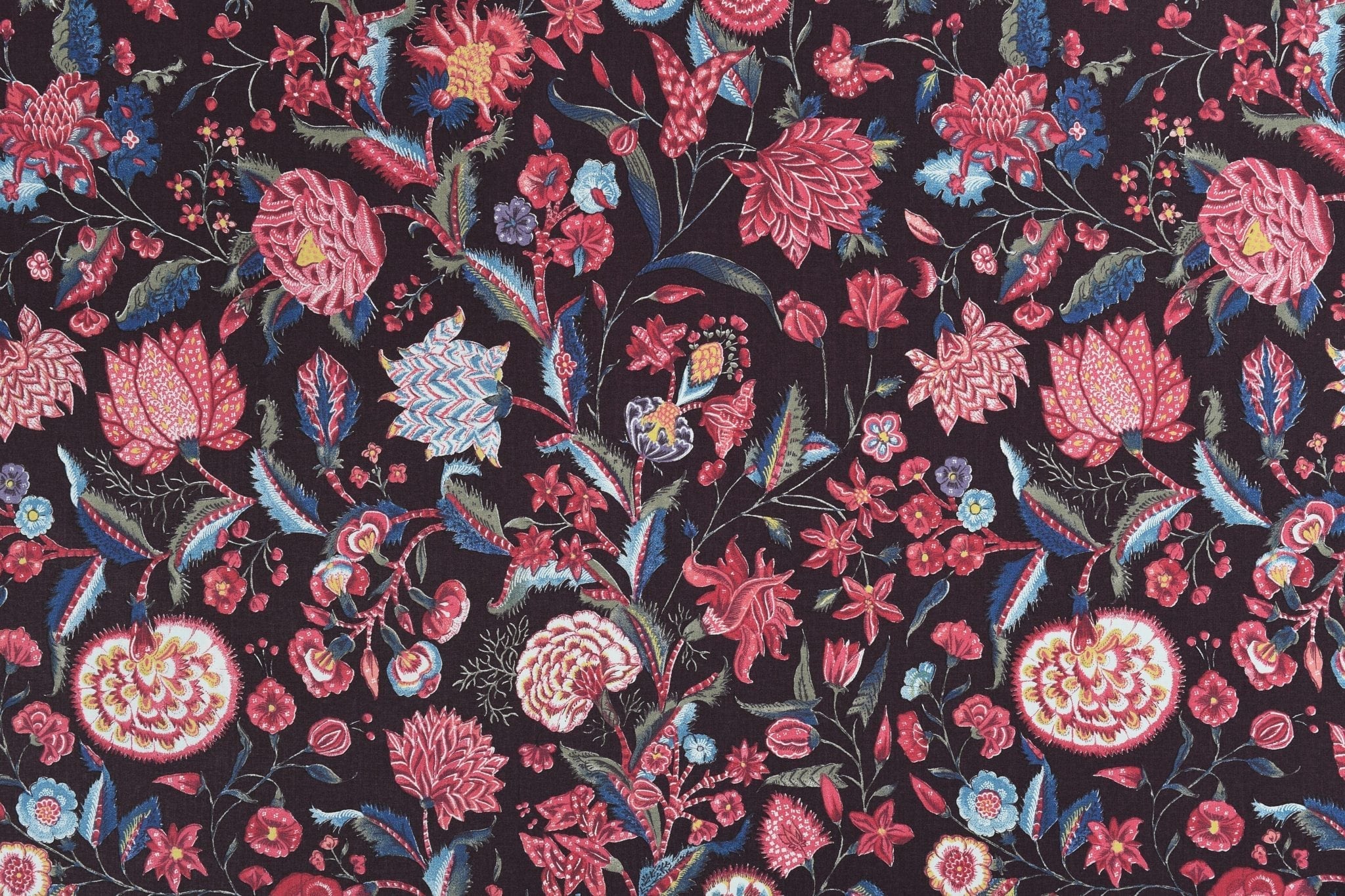 Fond brun foncé ‘nachtgrond’ , fleurs blue et rouge garance.