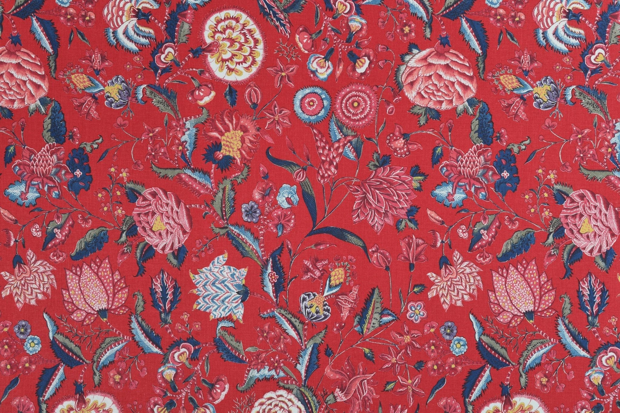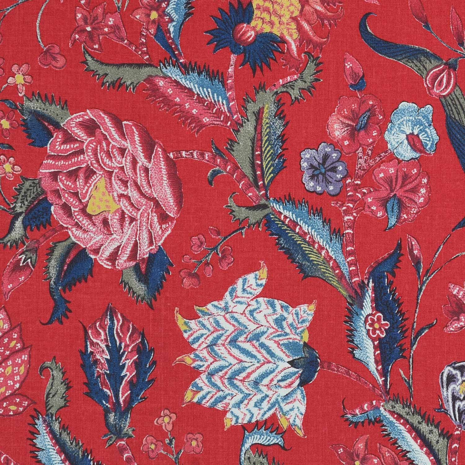 Fond rouge garance, fleurs bleu en rouges différentes.
