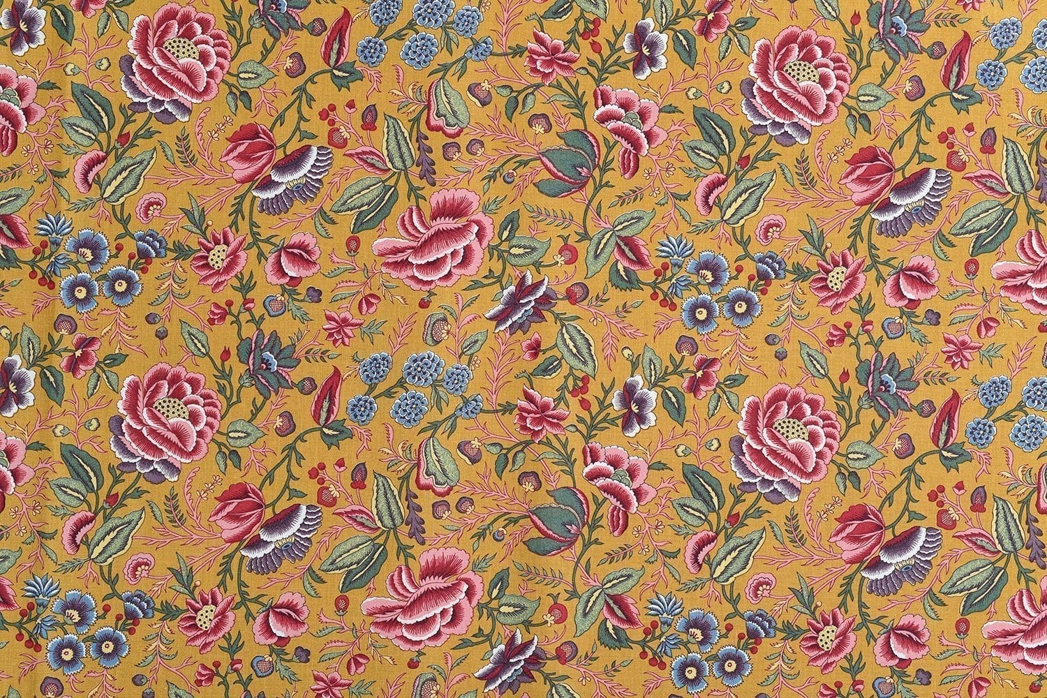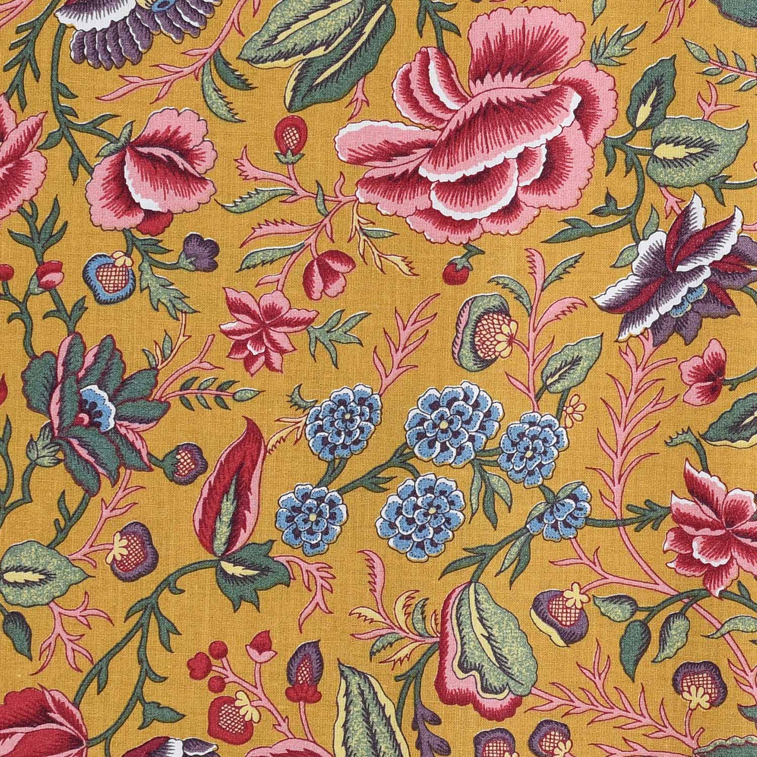 Fond ocre jaune, fleurs rouge et rose, multi couleur.