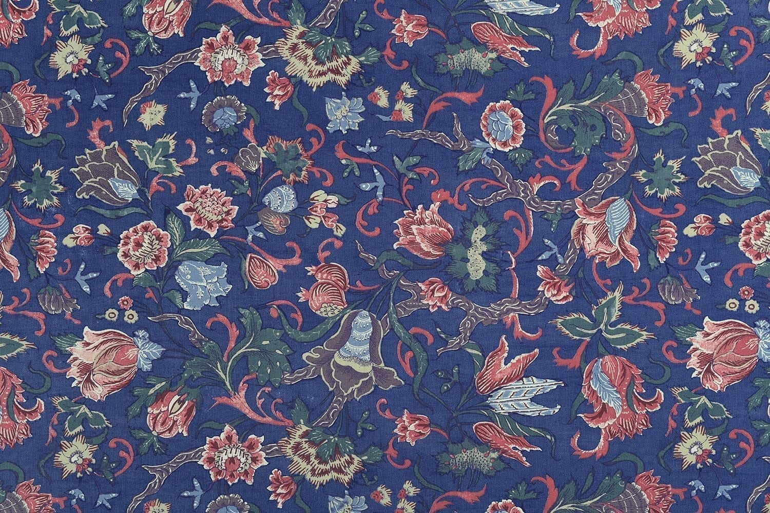 Donkerblauwe achtergrond met rode, rose en l.blauwe tulp motieven.