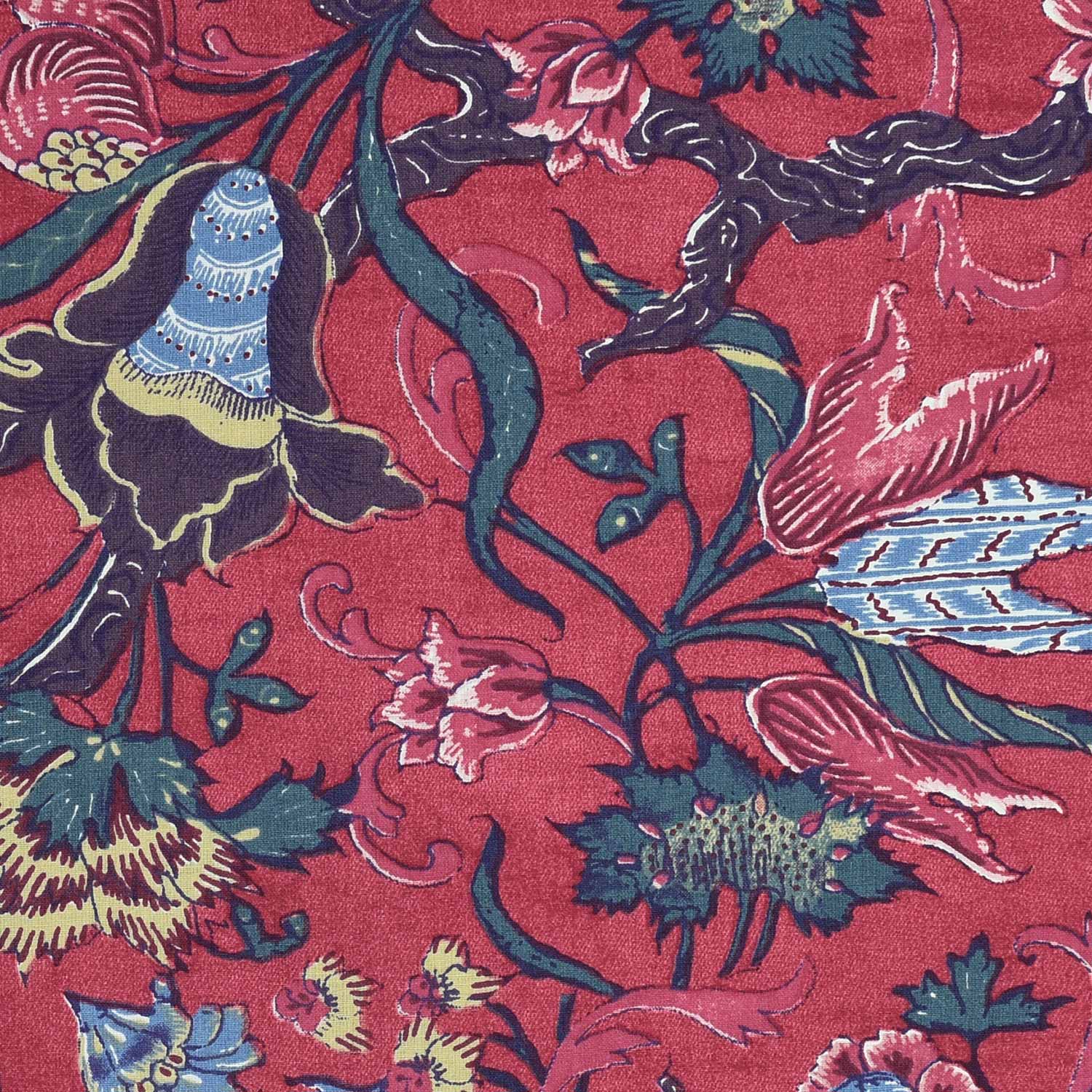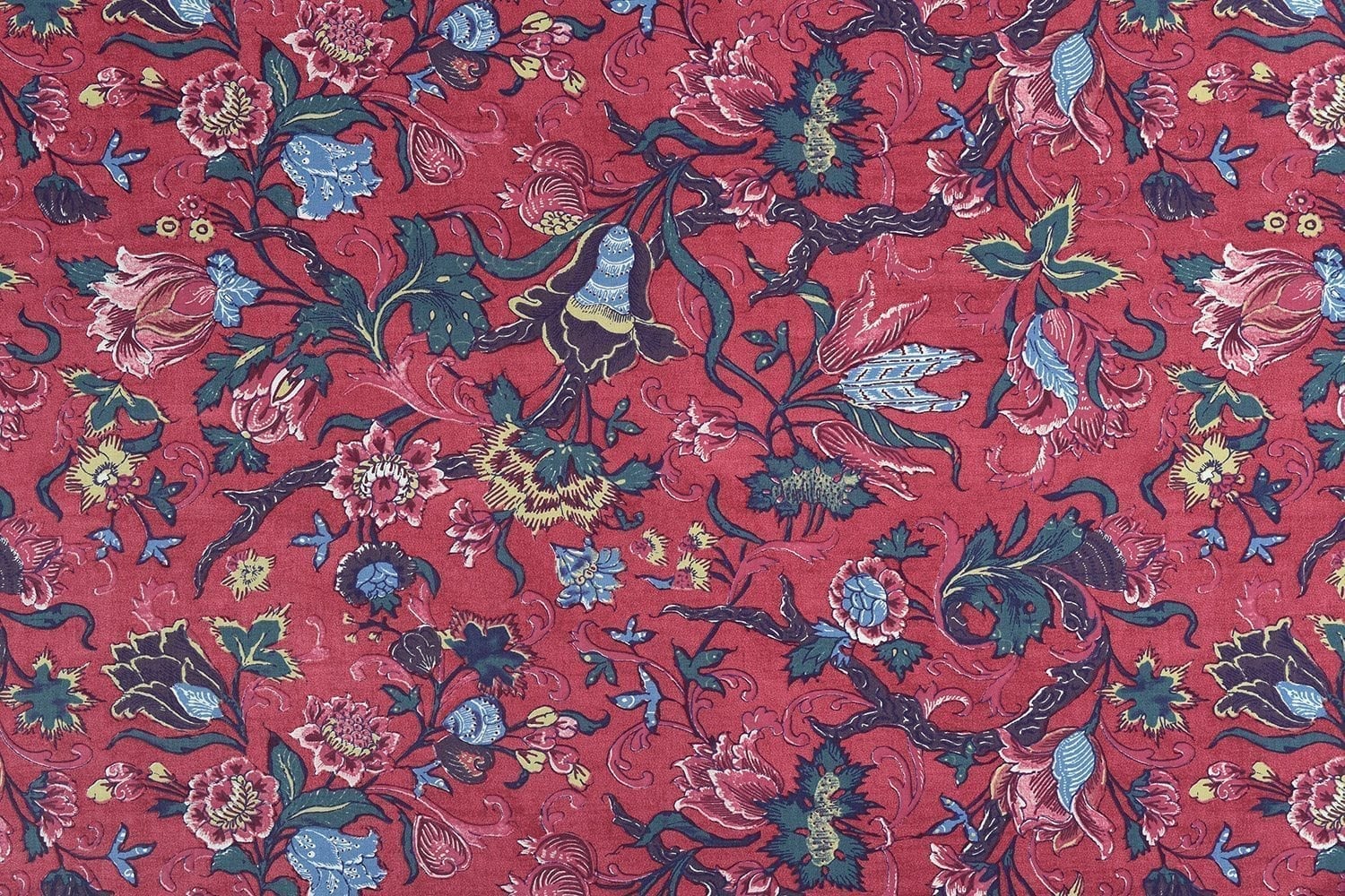 Antiek rode achtergrond met rode, rose en l.blauwe tulp motieven.